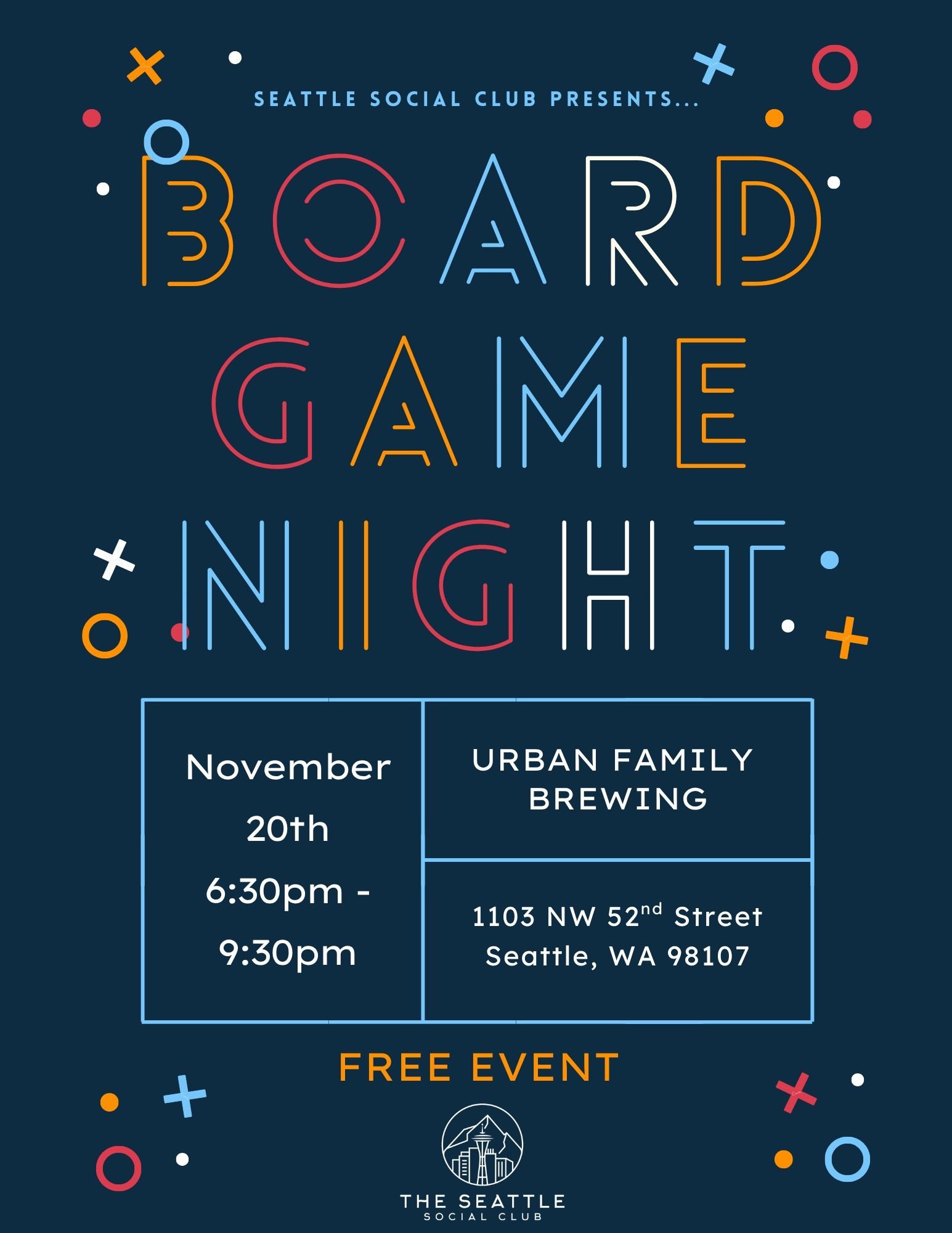 ![]() | Board Game Night Urban Family Brewing, Ballard November 20th @ 6:30 PM Come hang out at Urban Family Brewing in Ballard for a fun-filled evening of board games with friends and fellow game enthusiasts! We’ll have all the classics plus some fun new ones. Feel free to bring your own games! This is intended for everyone, whether you’re single or not! No Ticket Required! |