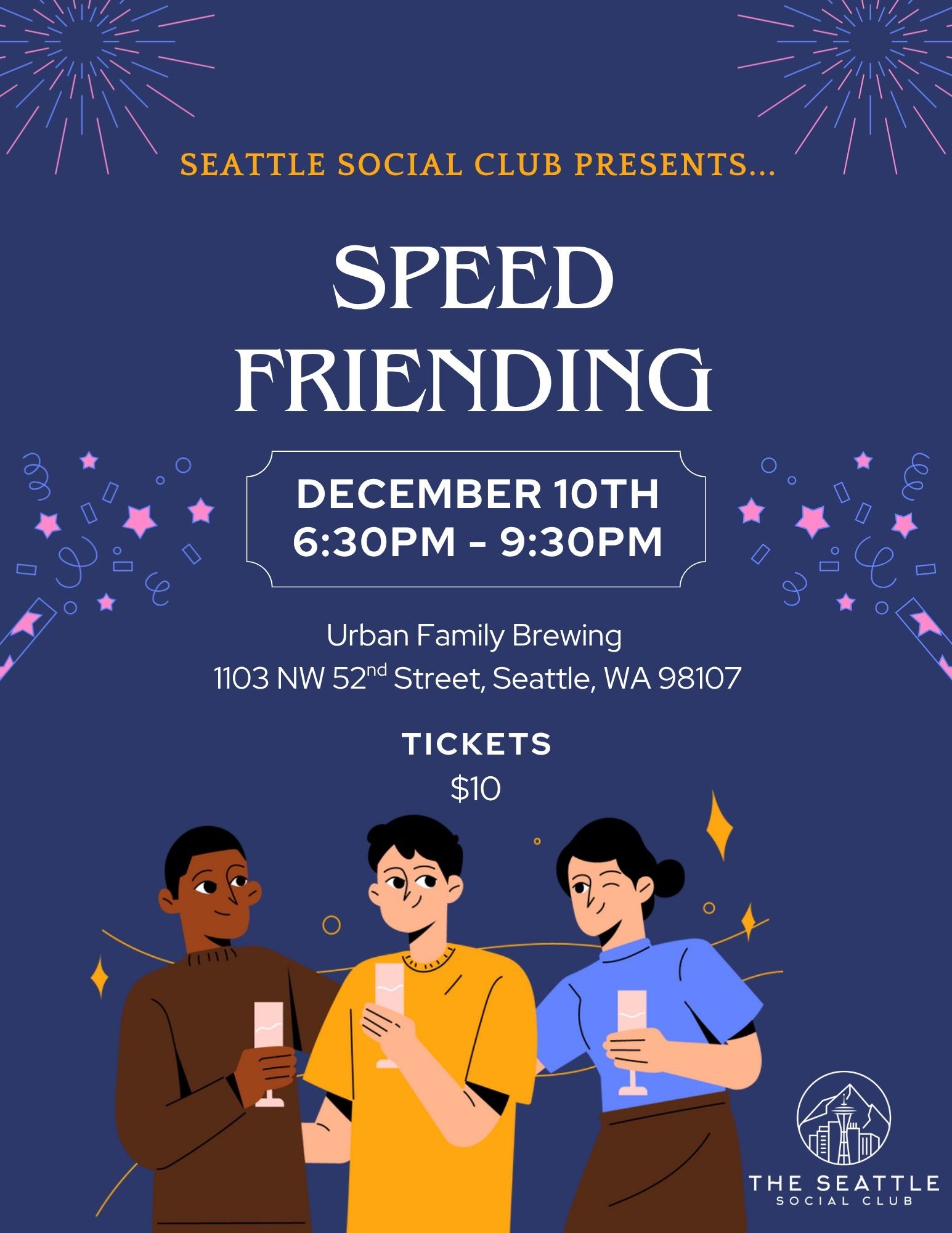 ![]() | Speed Friending Urban Family Brewing, Ballard December 10th @ 6:30 PM Join us at Urban Family Brewing Co. for a fun-filled event where you can make new friends in a flash! Whether you're new in town or just looking to expand your social circle, Speed Friending is the perfect opportunity to meet like-minded people in a relaxed and casual setting. Our event is all about breaking the ice and connecting with others through both quick, one-on-one conversations and group activities. Tickets $10 |